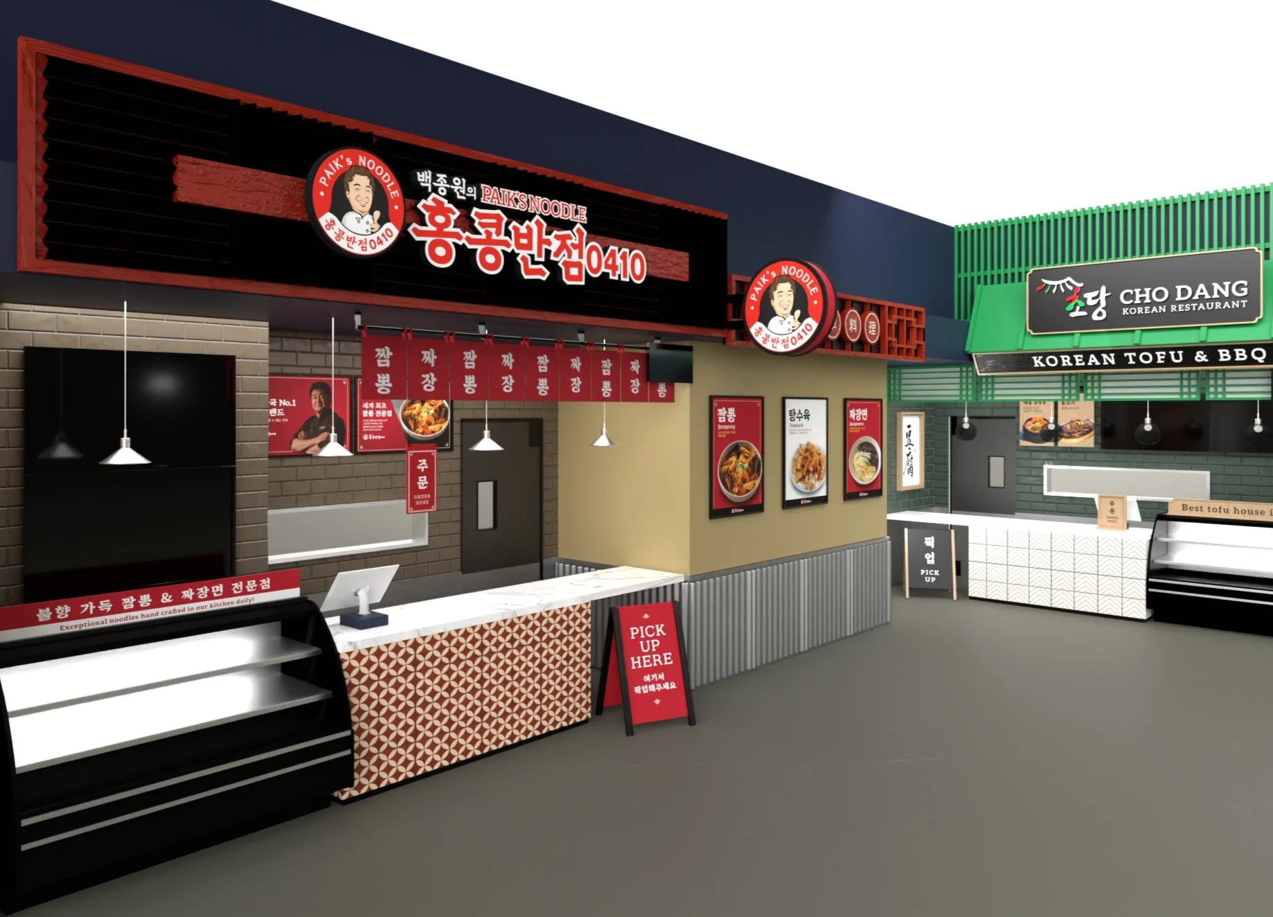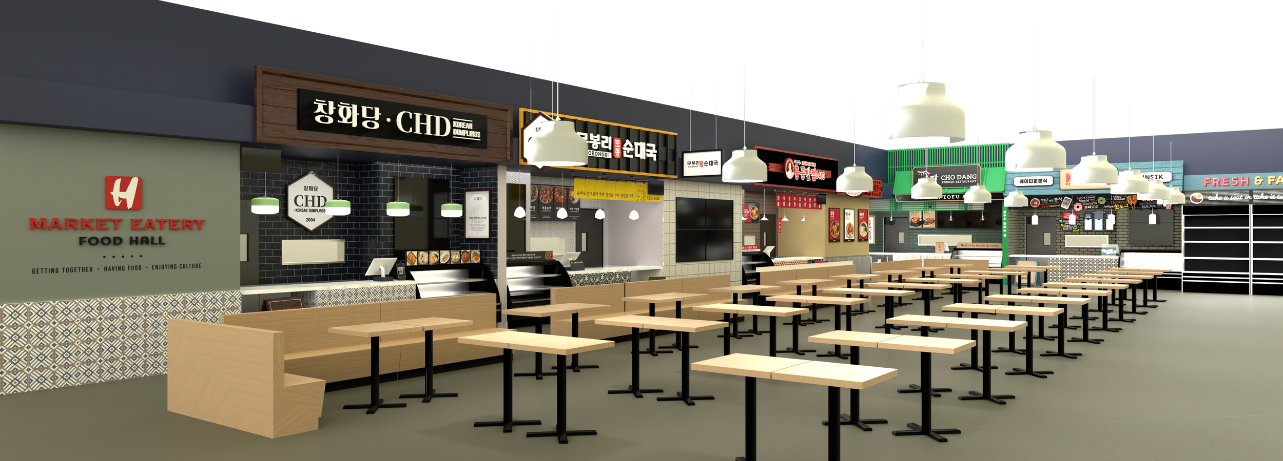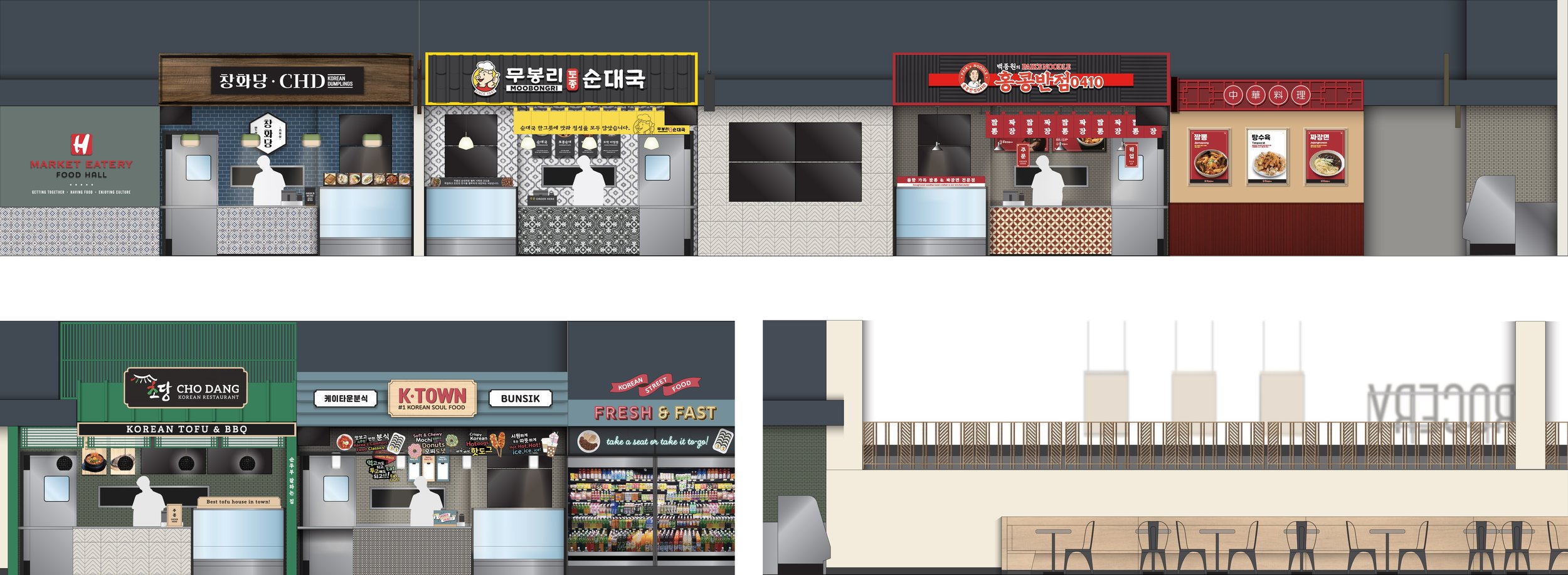 In planning the design, the main goal was to mirror the lively vibe of a Korean market or plaza, steering away from a high-end design approach. The emphasis was on creating a local, friendly atmosphere that's easy to connect with. The design aimed to invite customers in a casual way, tempting them to explore the delightful range of Korean cuisine being prepared within the space. Additionally, a considerable focus was placed on ensuring each tenant had a unique identity while maintaining an overall visual theme that embodies Korean culture. It was a delicate balance, allowing tenants to have their distinctiveness while contributing to an crucial Korean ambiance. Considering the lively setting of H Mart, the design strived for a bold and striking presence. It aimed to seamlessly blend into the dynamic environment, grabbing attention and establishing an appealing and prominent presence. This emphasis on visual impact was crucial in aligning the design with the lively atmosphere of the bustling marketplace.