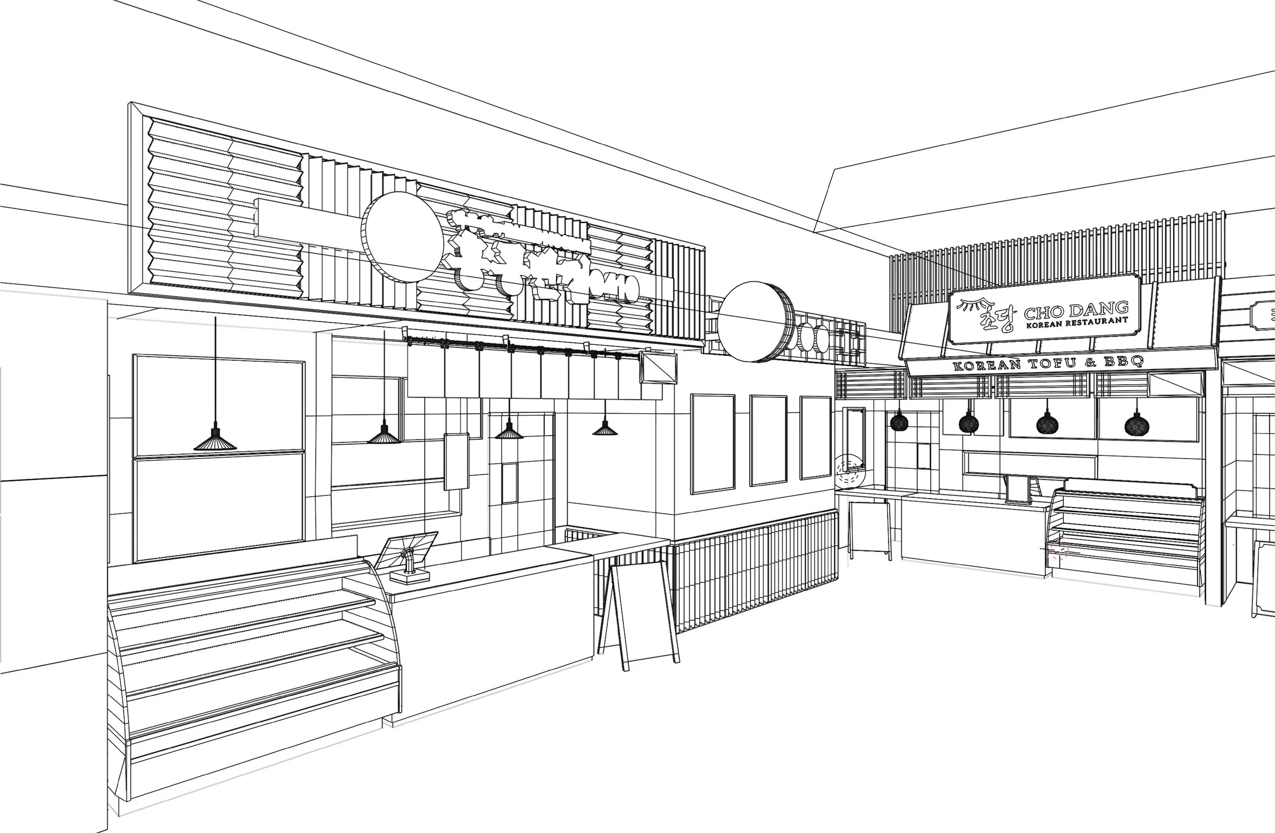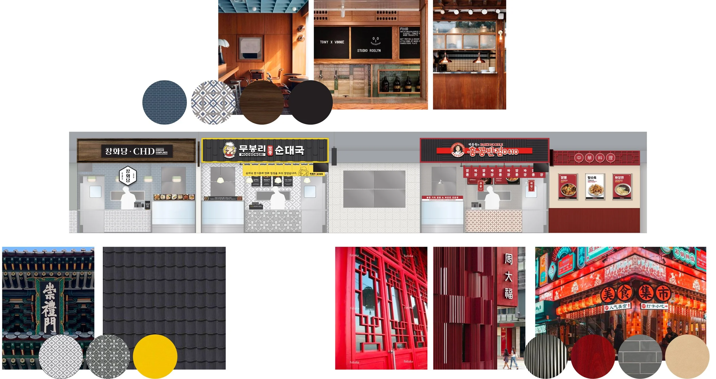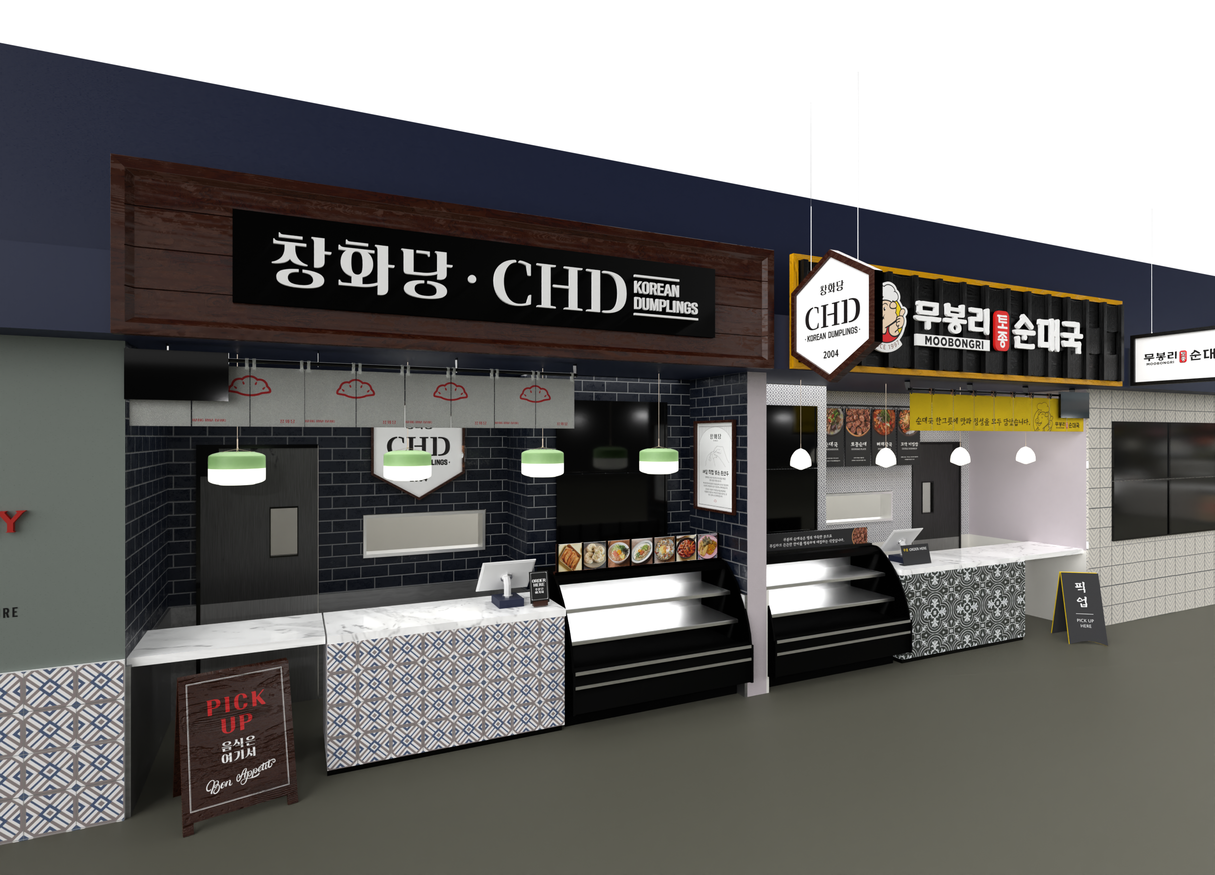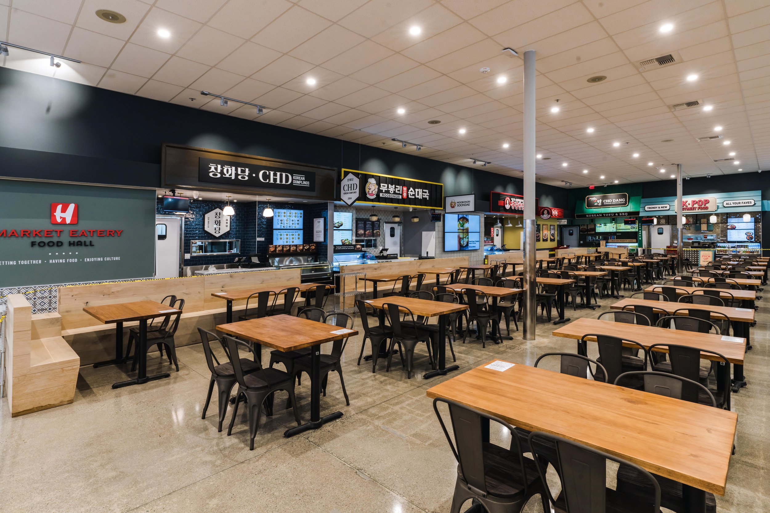 In planning the design, the main goal was to mirror the lively vibe of a Korean market or plaza, steering away from a high-end design approach. The emphasis was on creating a local, friendly atmosphere that's easy to connect with. The design aimed to invite customers in a casual way, tempting them to explore the delightful range of Korean cuisine being prepared within the space. Additionally, a considerable focus was placed on ensuring each tenant had a unique identity while maintaining an overall visual theme that embodies Korean culture. It was a delicate balance, allowing tenants to have their distinctiveness while contributing to an crucial Korean ambiance. Considering the lively setting of H Mart, the design strived for a bold and striking presence. It aimed to seamlessly blend into the dynamic environment, grabbing attention and establishing an appealing and prominent presence. This emphasis on visual impact was crucial in aligning the design with the lively atmosphere of the bustling marketplace.