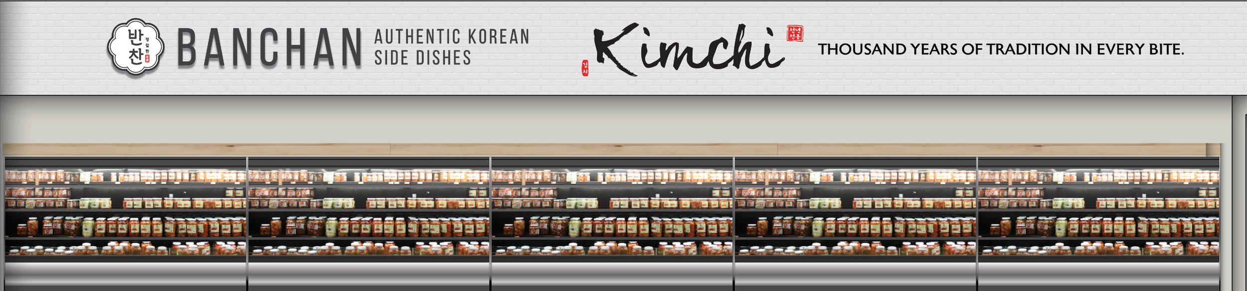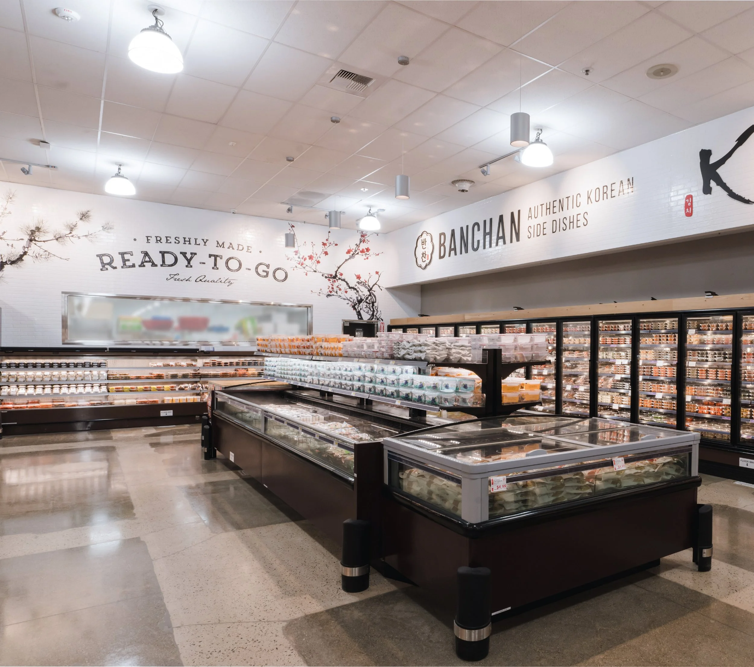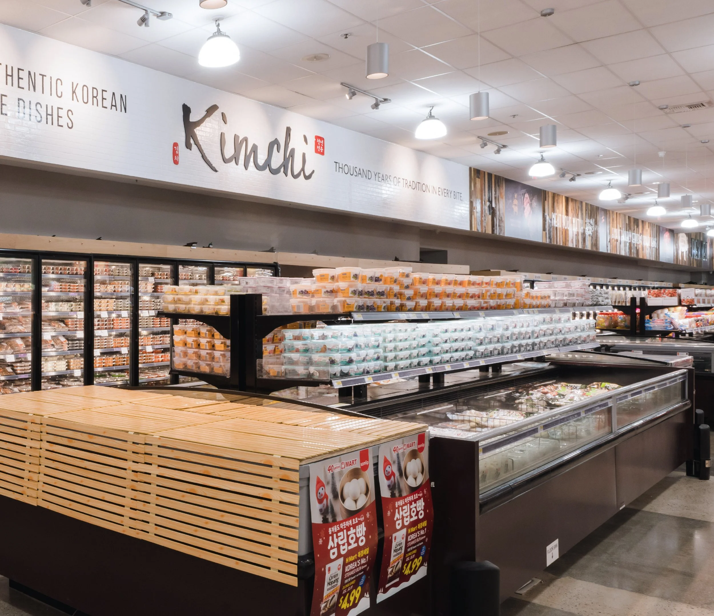One of H Mart's strengths is the Banchan and Kimchi section, renowned for its freshness. To enhance this, we opted for white tiles and added simple, monochrome graphics resembling Korean Ink paintings. The design aimed for a minimal and Asian aesthetic, creating a clean and distinctly Korean atmosphere in line with the products offered.