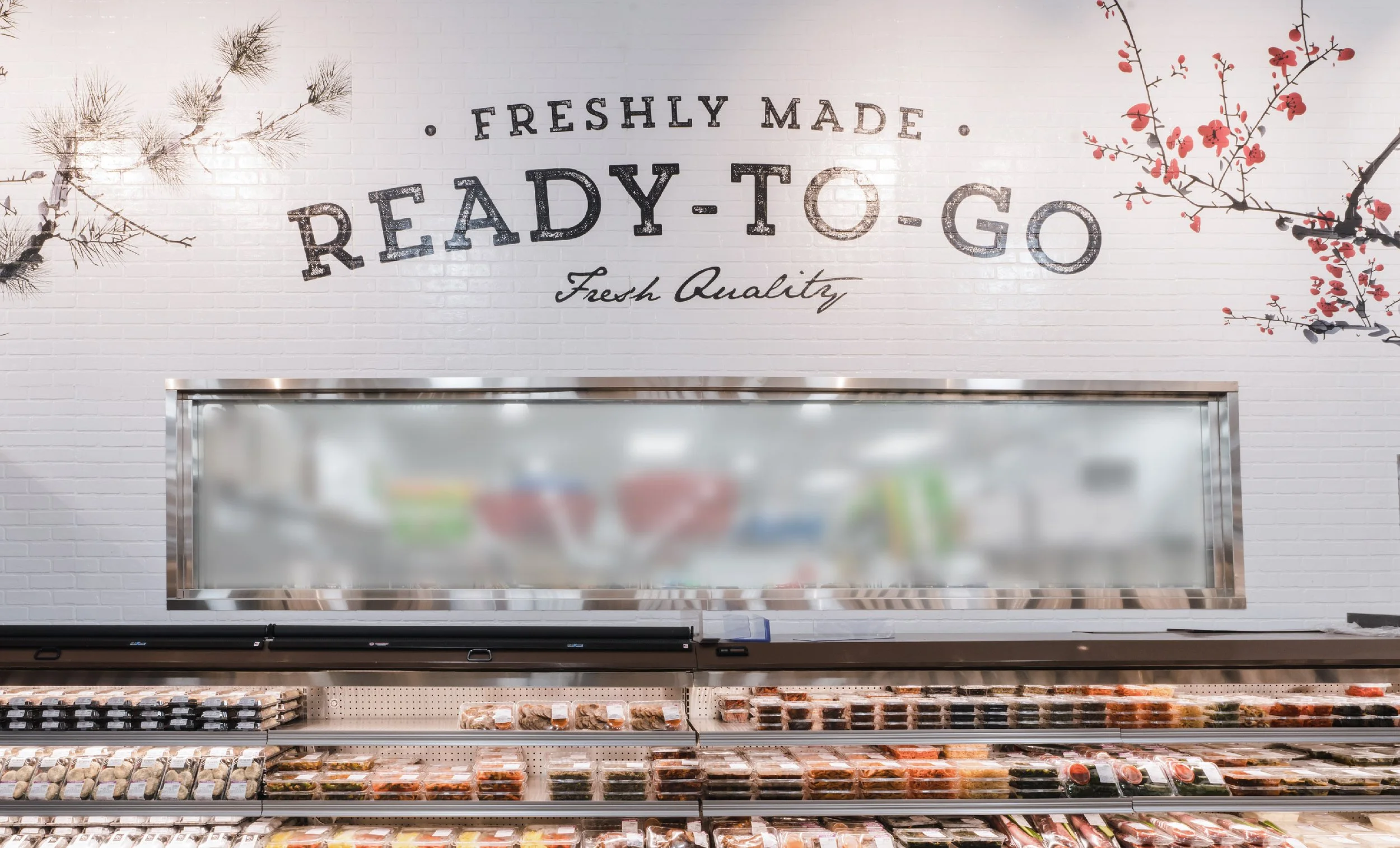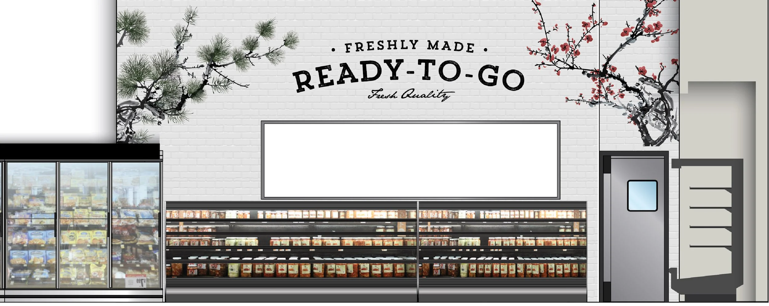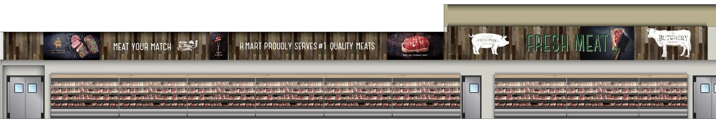 One of H Mart's strengths is the Banchan and Kimchi section, renowned for its freshness. To enhance this, we opted for white tiles and added simple, monochrome graphics resembling Korean Ink paintings. The design aimed for a minimal and Asian aesthetic, creating a clean and distinctly Korean atmosphere in line with the products offered.