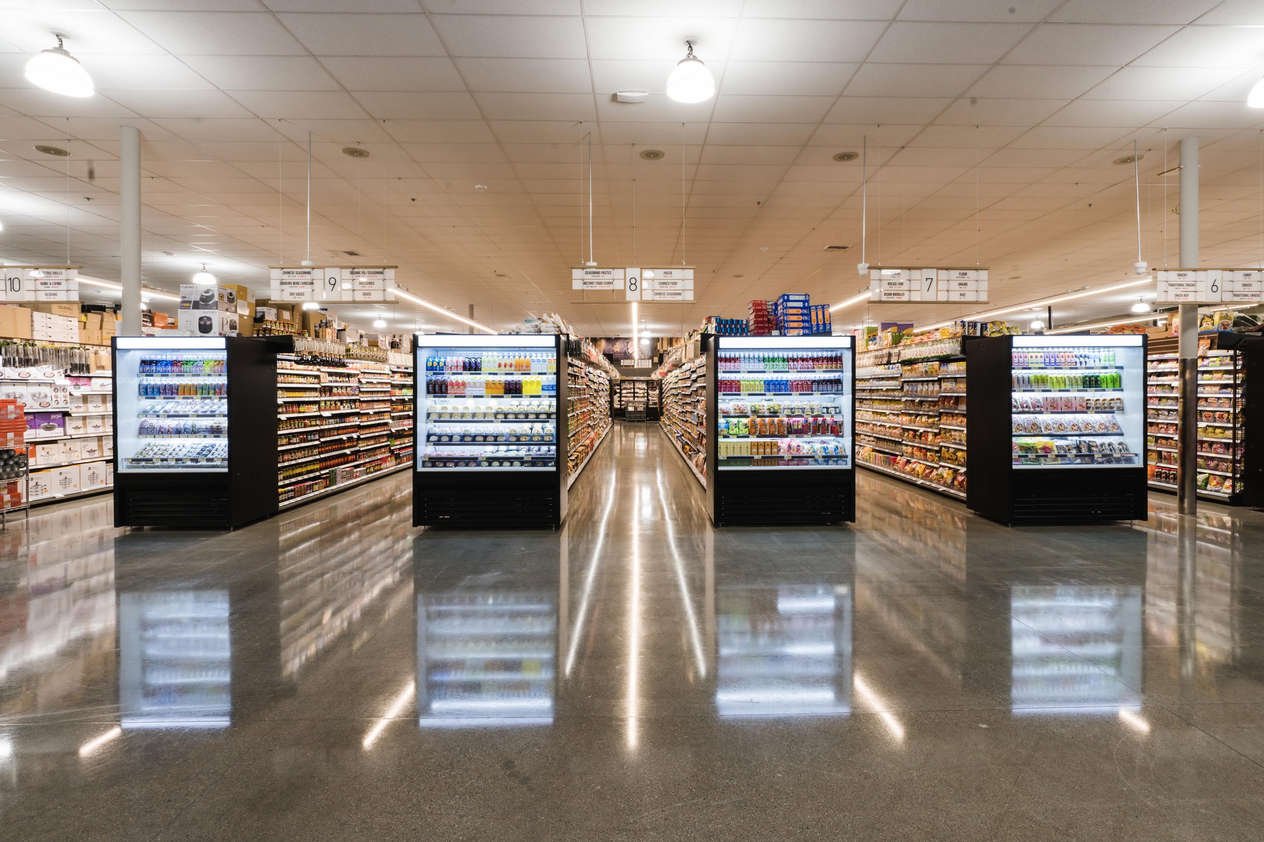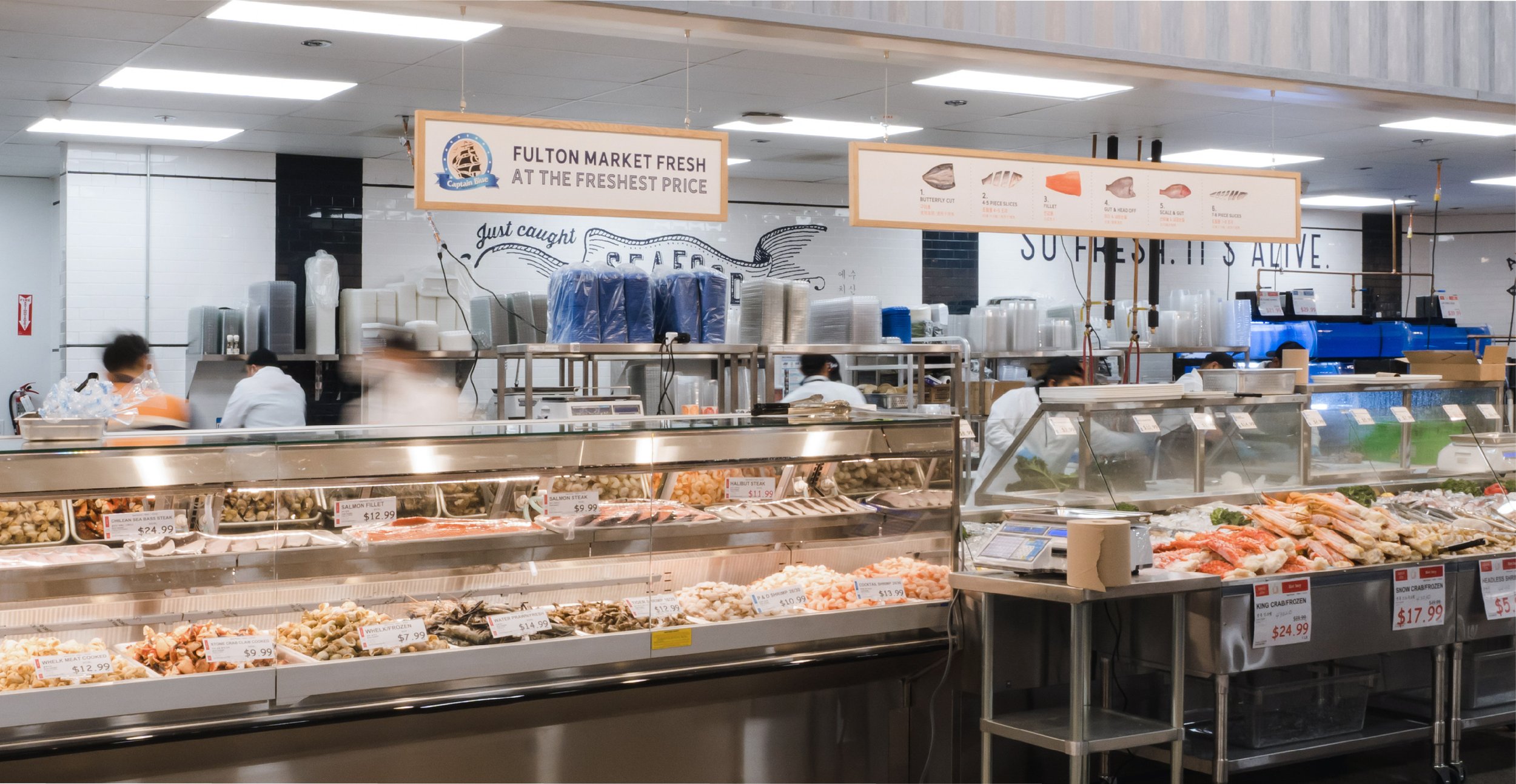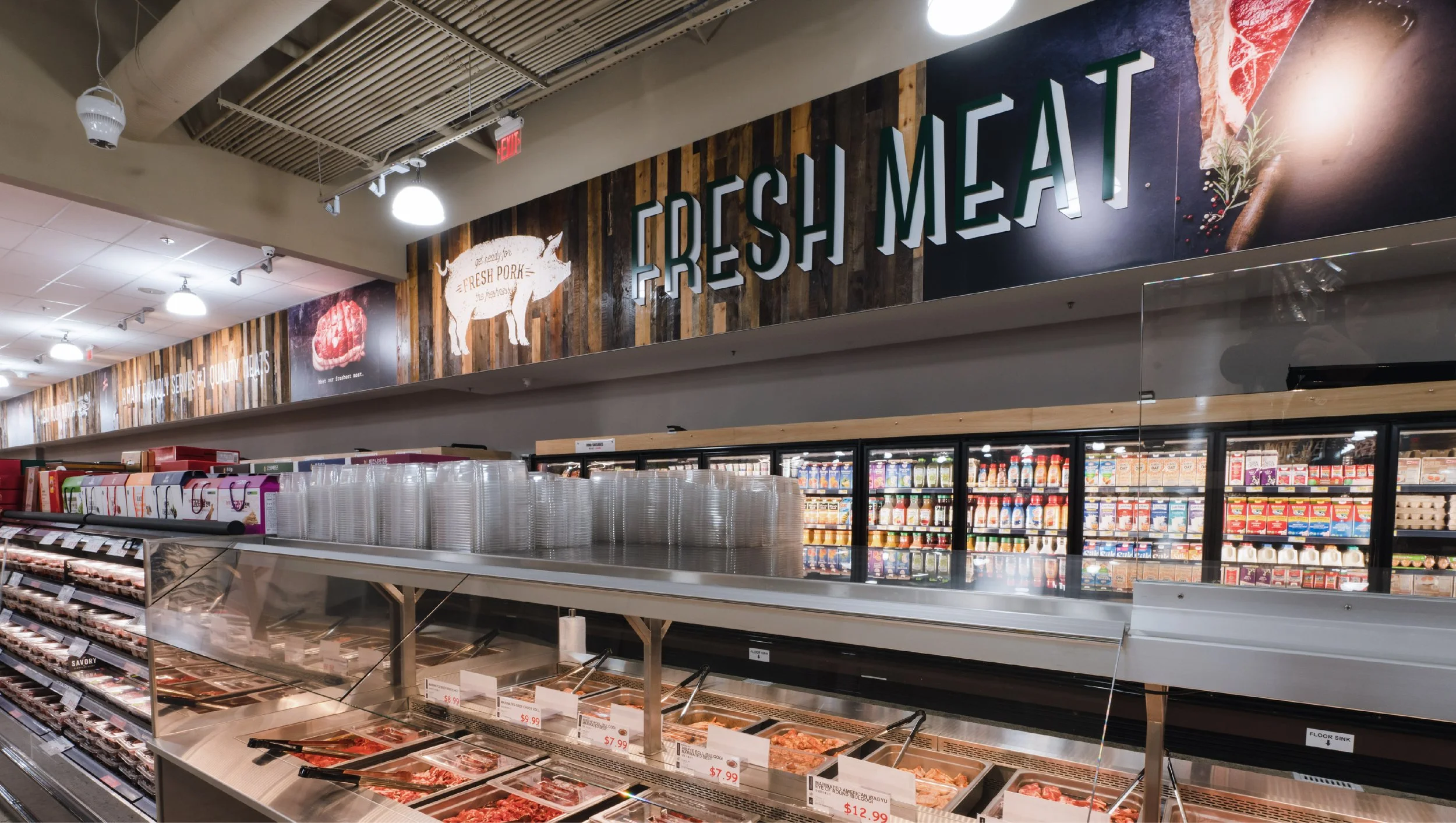 Meanwhile, the seafood section features brushed corrugated metal panels, not only fitting an industrial, rustic look but also guiding customers seamlessly from the meat section to maintain a consistent and appealing design.
