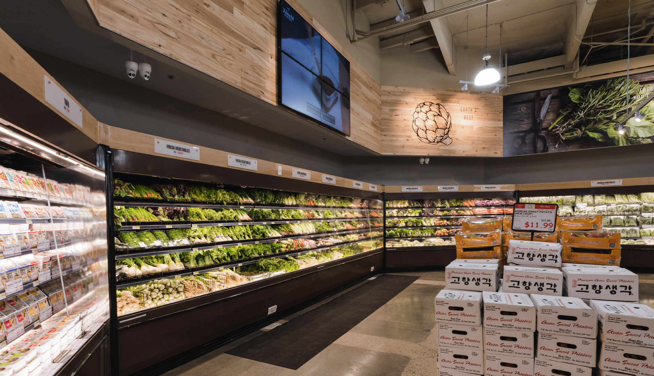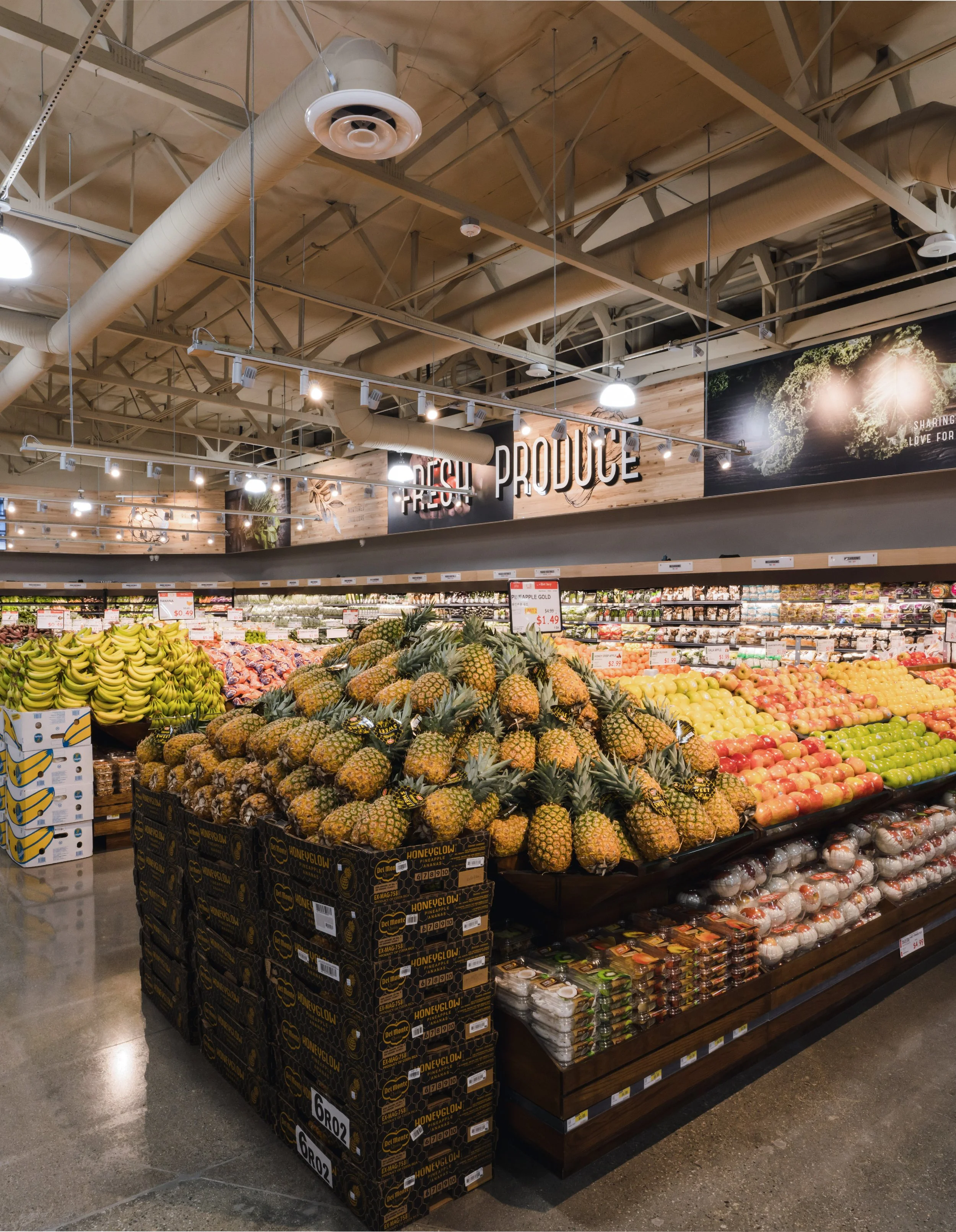 Selecting the right materials was crucial for the store design. When customers enter, they're greeted by the lively produce section adorned with light-colored hickory wood planks, creating a welcoming atmosphere for picking fresh produce.